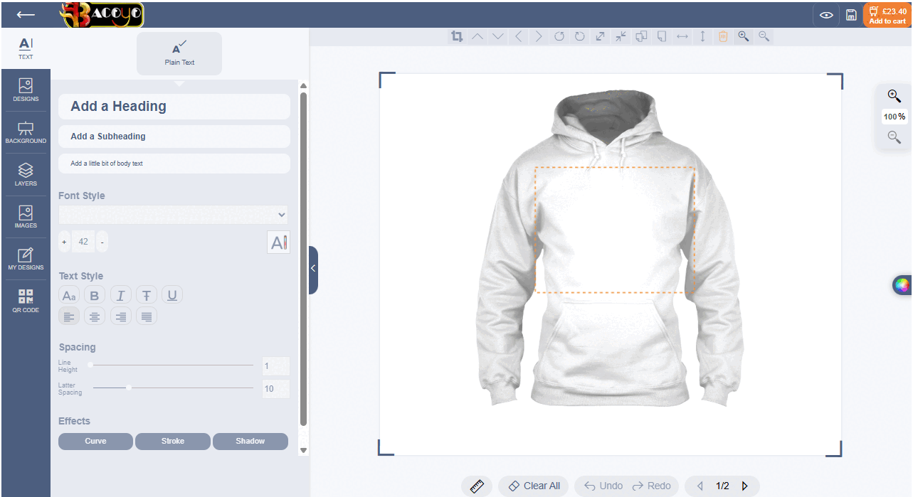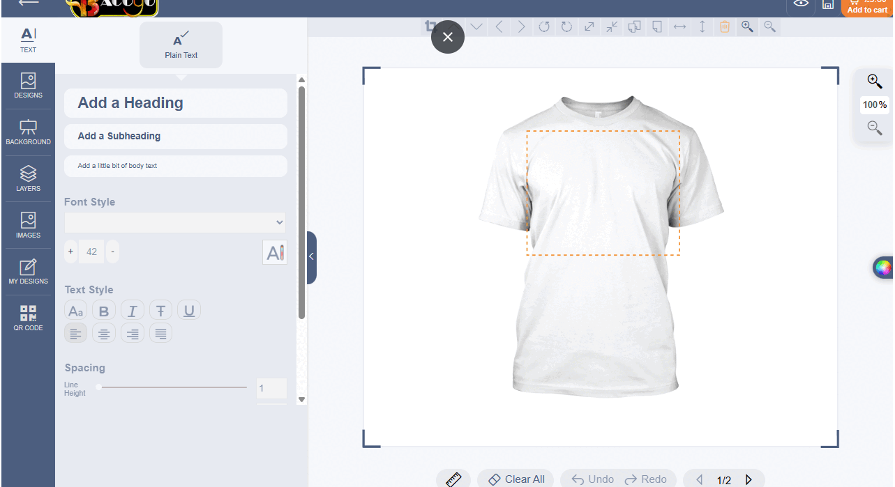 Get ready to step into the next generation of custom fashion and design like never before! With our Next-Gen Design Tool, where creativity meets technology, effortlessly bring your ideas to life with advanced personalization tools: add text, upload your own images, explore a wide range of clipart images, and instantly create stunning, production-ready apparel delivered straight to your door.